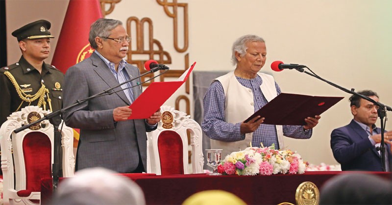 গতকাল রাত সোয়া ৯টায় দেশী-বিদেশী ৪ শ’ অতিথির উপস্থিতে শপথ নেন ড. মুহাম্মদ ইউনূস। পরপর শপথ গ্রহণ করেন দু’জন শিক্ষার্থী প্রতিনিধিসহ ১৩ জন। তাদেরও শপথ বাক্য পাঠ করিয়েছেন প্রেসিডেন্ট মোহাম্মদ সাহাবুদ্দিন। ঢাকার বাইরে অবস্থান করায় ফারুক ই আযম, বিধান রঞ্জন রায় ও সুপ্রদীপ চাকমা উপদেষ্টা হিসেবে শপথ নিতে পারেন নি। ড. মুহাম্মদ ইউনূস ছাড়া অন্য উপদেষ্টারা হলেন, বাংলাদেশ ব্যাংকের সাবেক গভর্ণর ড. সালেহ উদ্দিন আহমেদ, ঢাকা বিশ্ববিদ্যালয়ের আইন বিভাগের অধ্যাপক ড. আসিফ নজরুল, মানবাধিকার সংগঠন ‘অধিকার’র প্রধান অ্যাডভোকেট আদিলুর রহমান খান, সাবেক অ্যাটর্নি জেনারেল ও তত্ত্বাবধায়ক সরকারের সাবেক উপদেষ্টা এএফ হাসান আরিফ, অবসরপ্রাপ্ত পররাষ্ট্র সচিব তৌহিদ হোসেন, পরিবেশ আইনবিদ সমিতি ‘বেলা’র প্রধান নির্বাহী অ্যাডভোকেট সৈয়দা রিজওয়ানা হাসান, বৈষম্য বিরোধী ছাত্র আন্দোলনের সমন্বয়ক মো: নাহিদ ইসলাম ও আসিফ মাহমুদ সজীব ভূঁইয়া, সাবেক নির্বাচন কমিশনার ব্রিগেডিয়ার জেনারেল (অব:) এম সাখাওয়াত হোসেন, নারী নেত্রী ফরিদা আখতার, বাংলাদেশী সুন্নি দেওয়াবন্দী ইসলামিক ব্যক্তিত্ব ড. আ.ফ.ম খালিদ হাসান, গ্রামীণ টেলিকমের পরিচালক নুরজাহান বেগম এবং ‘ব্্রতী’র প্রধান নির্বাহী শারমিন মুরশিদ।